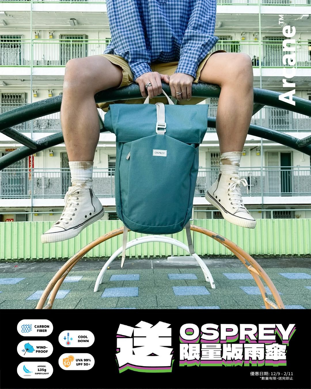 現凡購買 Arcane系列指定產品,即送Osprey 限量版碳纖防風防曬摺疊傘
