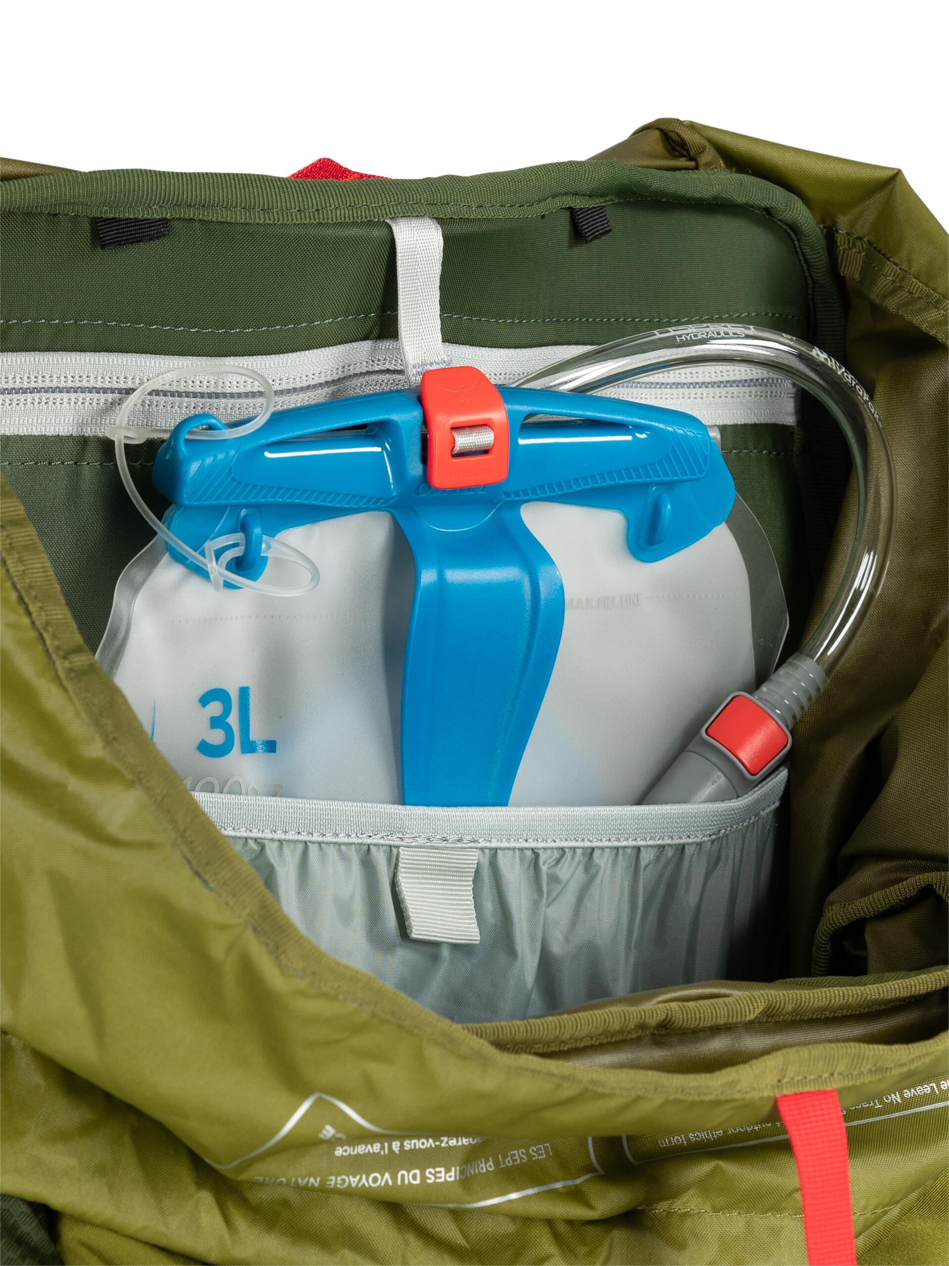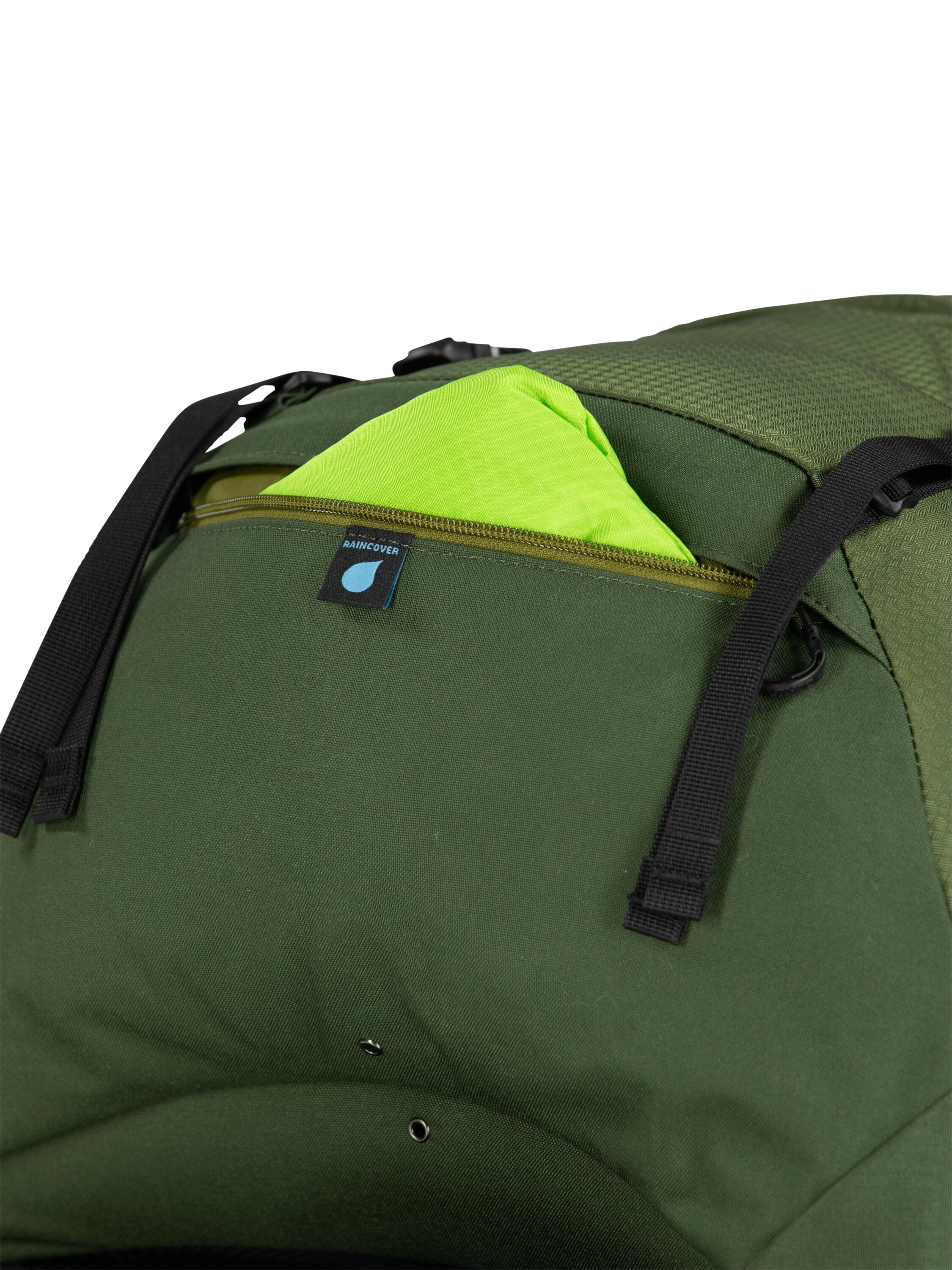 雙冰斧環、睡墊可拆式外掛帶,以及內置水袋隔層與中心出口設計,滿足山野多元用途。 - 環保耐用材料