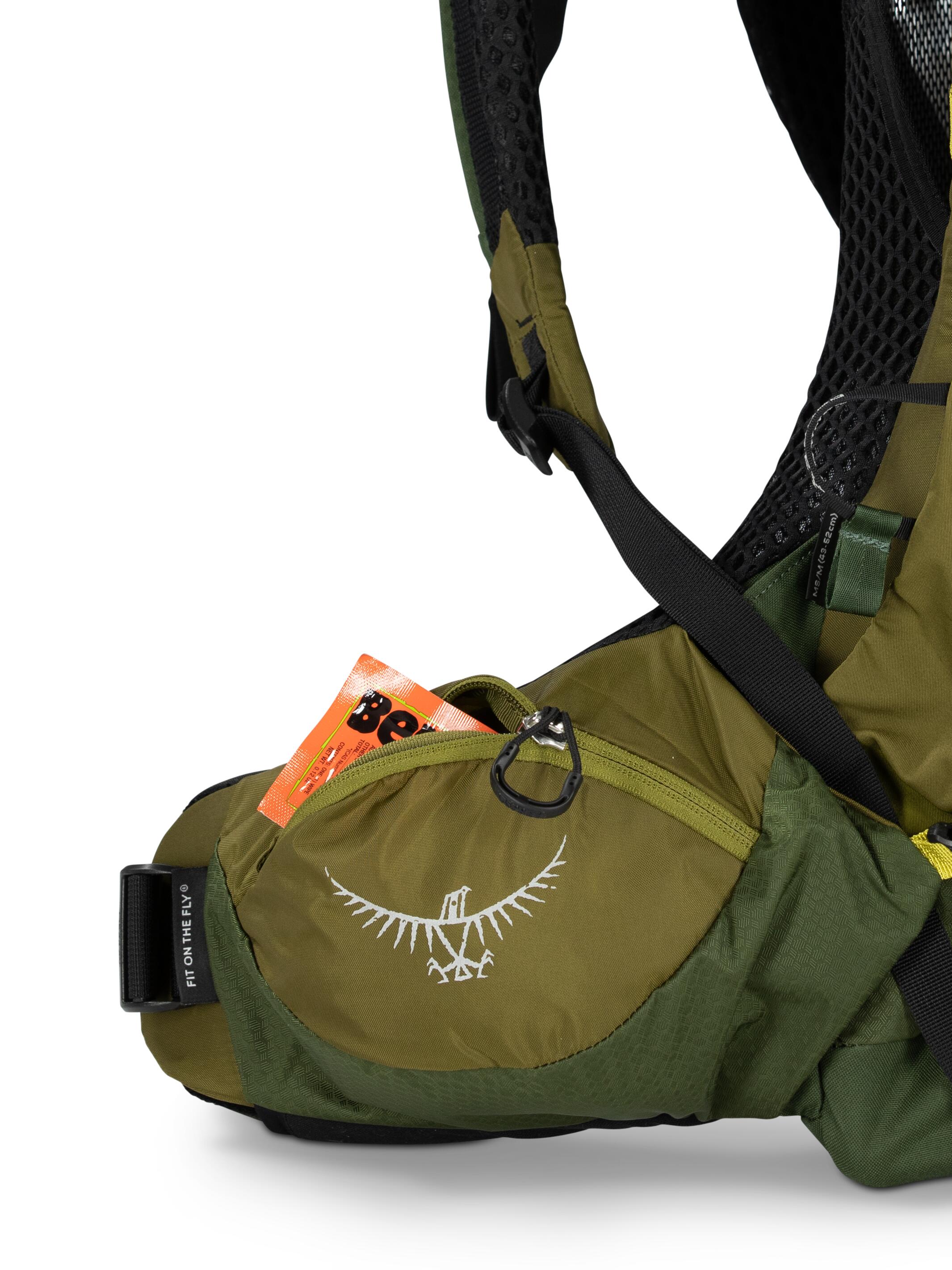 前推物袋(加強布料)、Tall dual-access側水瓶口袋、雙側壓縮帶、拉鍊式腰帶口袋,能快速存取各種必需品。