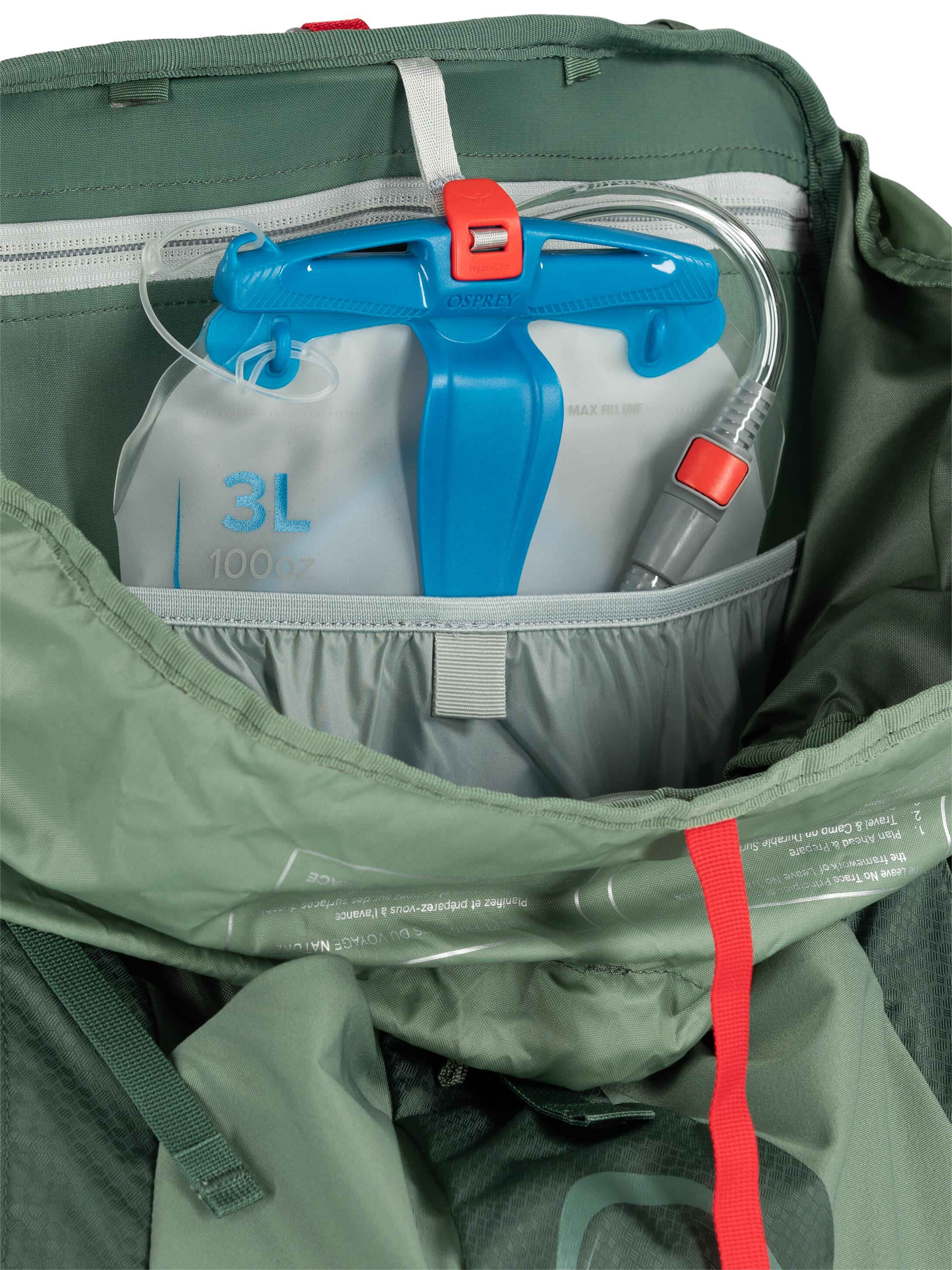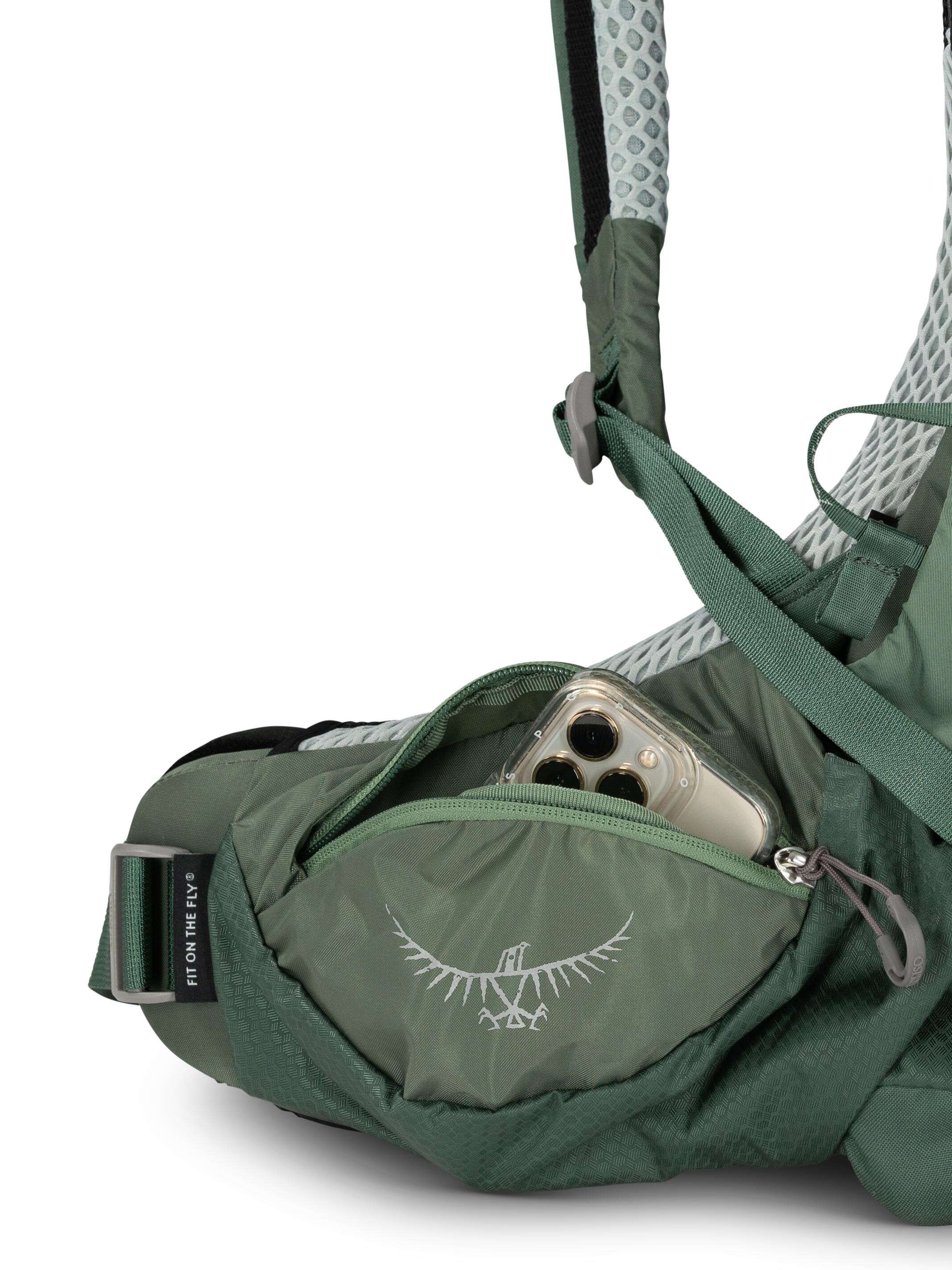 配備集成雨罩,側面單側曲線拉鍊主隔層入袋,浮動頂蓋含繩扣點,布料加強推物袋,雙高身雙向開口側水瓶袋,雙拉鍊腰帶袋,雙上下壓縮帶及可拆卸睡墊固定帶。 - 附件掛點