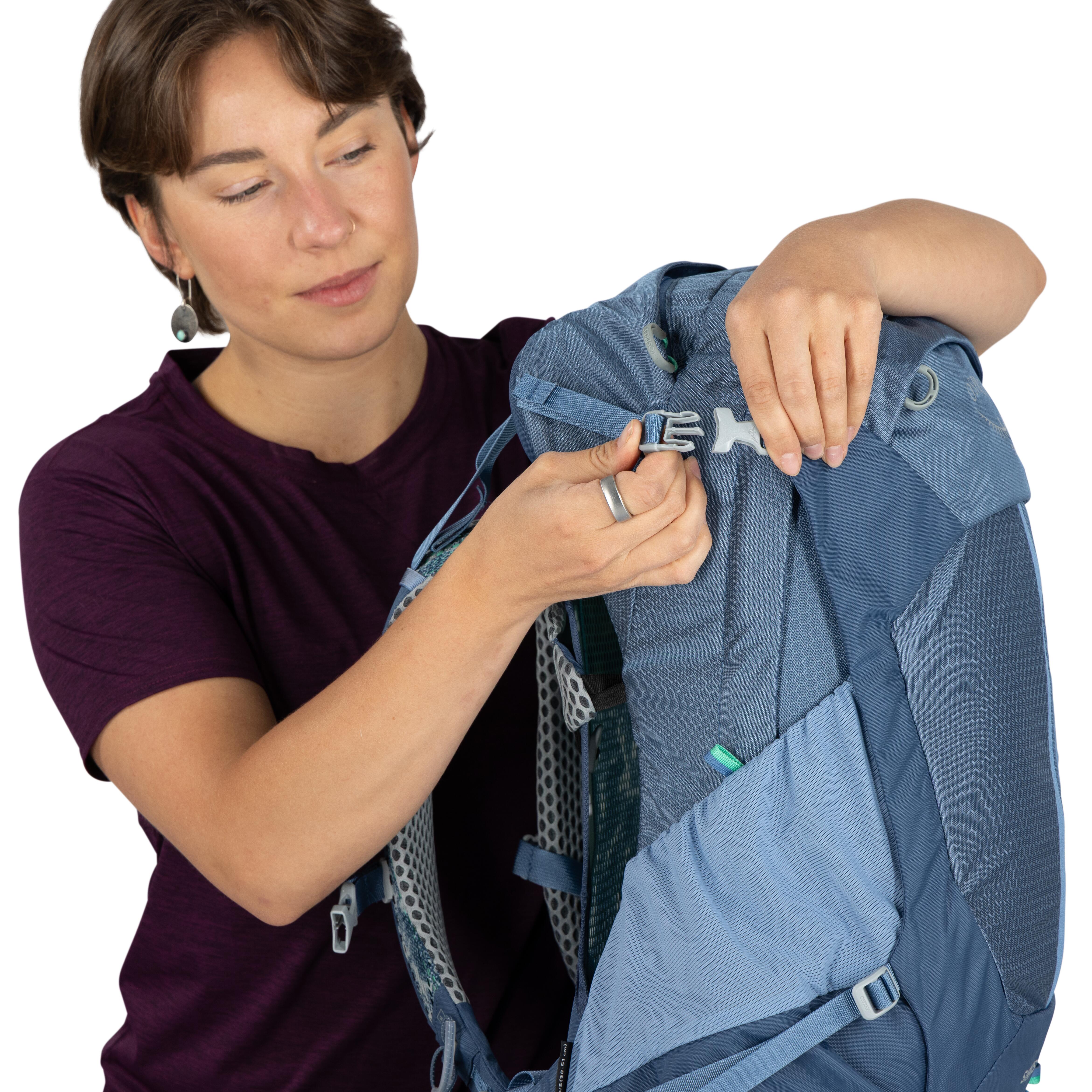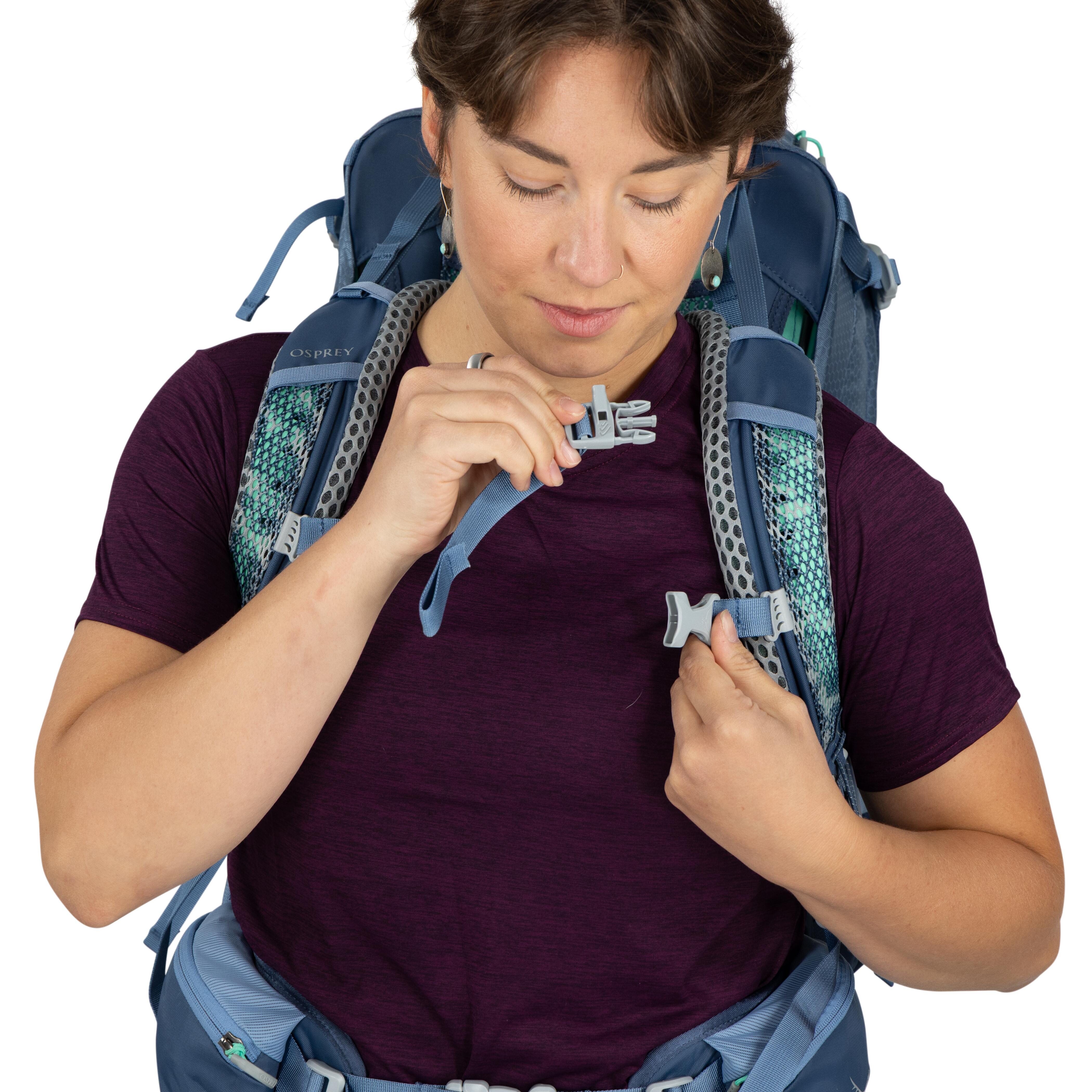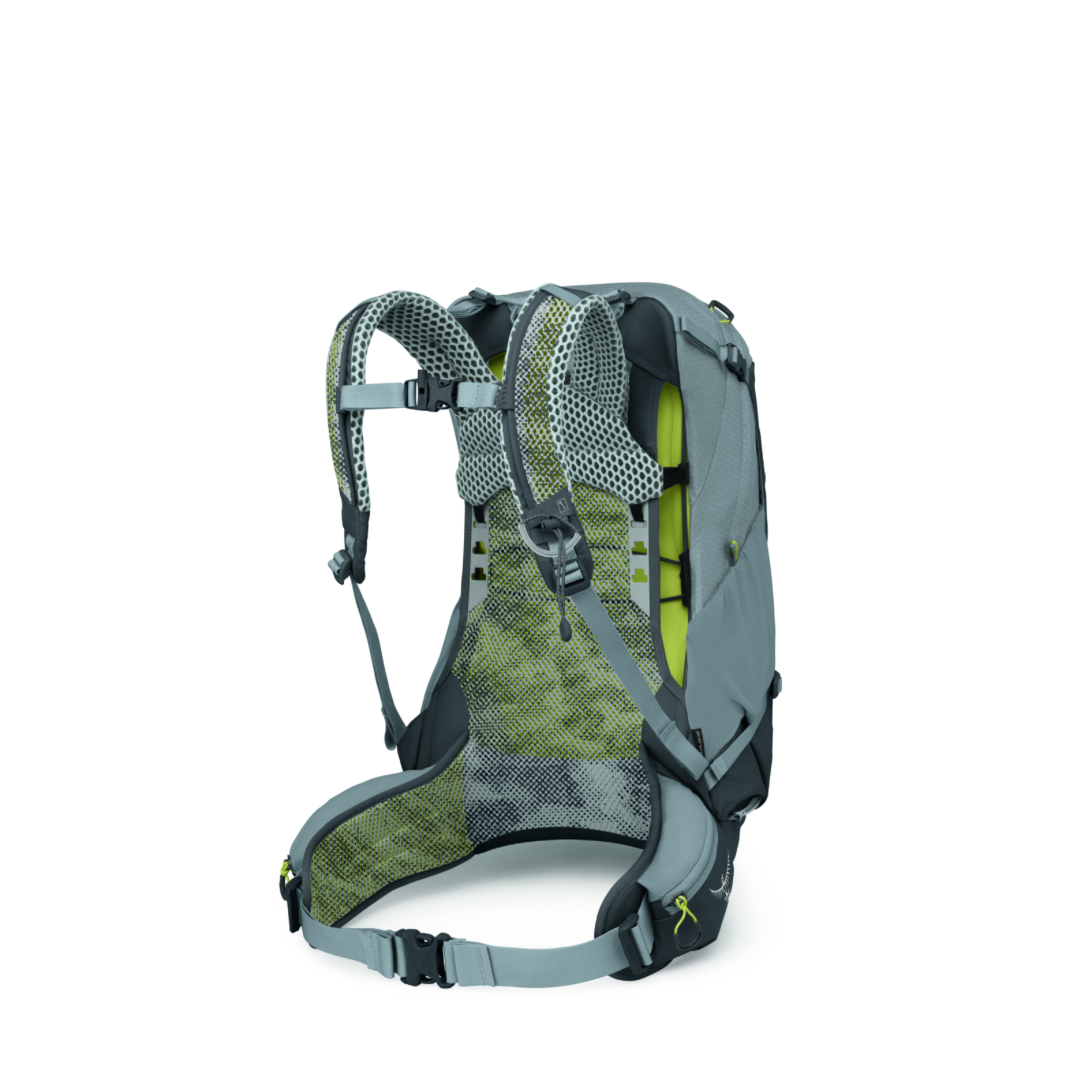 Stratos 24 採用 AirSpeed™ 張力網狀背板,搭配 LightWire 周邊框架,將背包重量推離背部,形成持續氣流對流,大幅提升背部通風,減少出汗與悶熱感。Molded Ladder 軀幹調節系統可調節 4 英寸(約 10cm),適用範圍約 43–56cm(17–22 in),確保精準貼合。肩帶與腰帶均採用高透氣模切 EVA 泡棉,包裹寬間隔網布,提供全天候舒適承載。腰帶 ErgoPull 閉合系統確保緊密貼合,提升負載轉移效果。