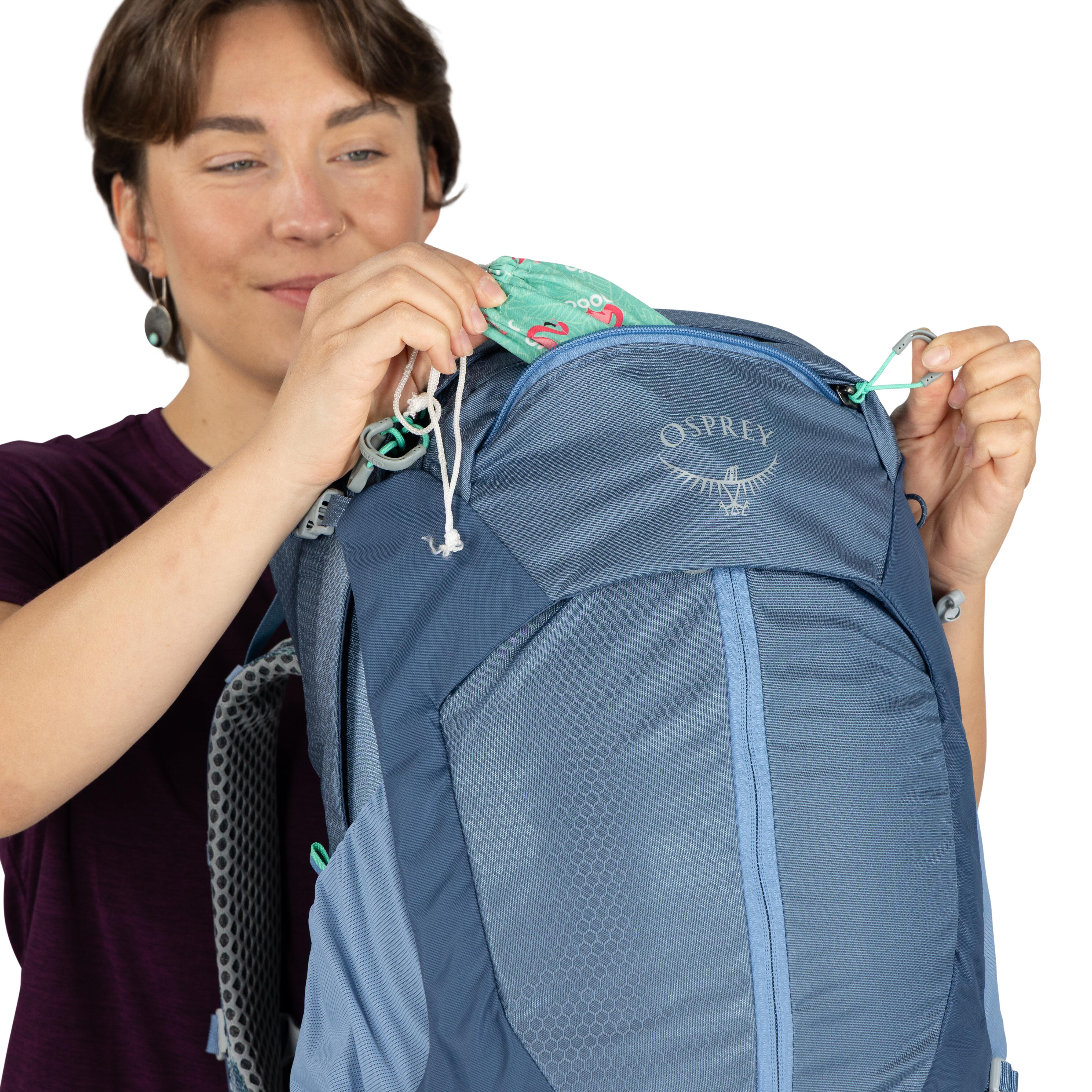 主艙採面板式雙拉鍊開口,取物直觀方便。底部獨立收納袋內建 S 碼防雨罩(bluesign® 認證物料+無 PFAS DWR 處理),突遇惡劣天氣可快速防護。頂部拉鍊網袋附鑰匙扣,前方頂部拉鍊口袋可放太陽眼鏡等精緻物品。腰帶雙拉鍊口袋方便行進中取用小物。內建水袋套,水管出口設於背板,附 Hydraclip 掛鉤,可加購 3L 水袋。Stow-on-the-Go 登山杖固定裝置、單冰斧環與彈力繩設計,提升戶外活動便利性。