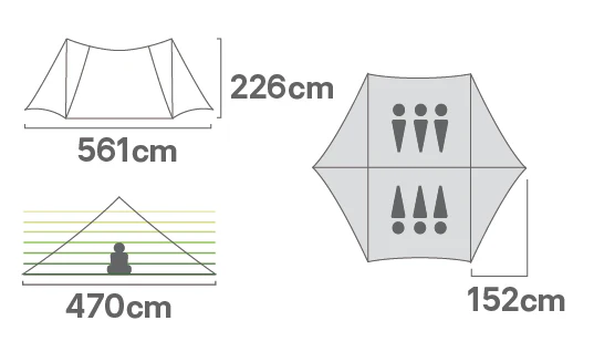 NEMO Hexalite EVO 6P 是一款具備高天花板和無底設計的大型露營天幕,提供寬敞的戶外生活空間,適合4至6人使用。其無地面設計讓使用者無需脫鞋便可自由走動,並且設計使搭建過程直覺且快速,約五分鐘內即可完成,適合初學者與經驗豐富的戶外愛好者。此帳篷非常靈活,可依據不同場合如團體露營、基地營遮陽等多種場景排列設置。