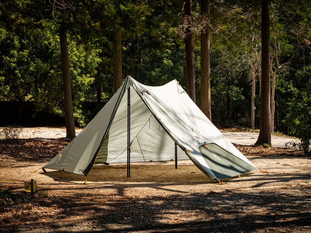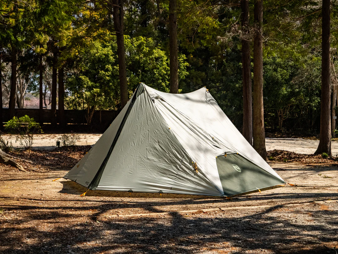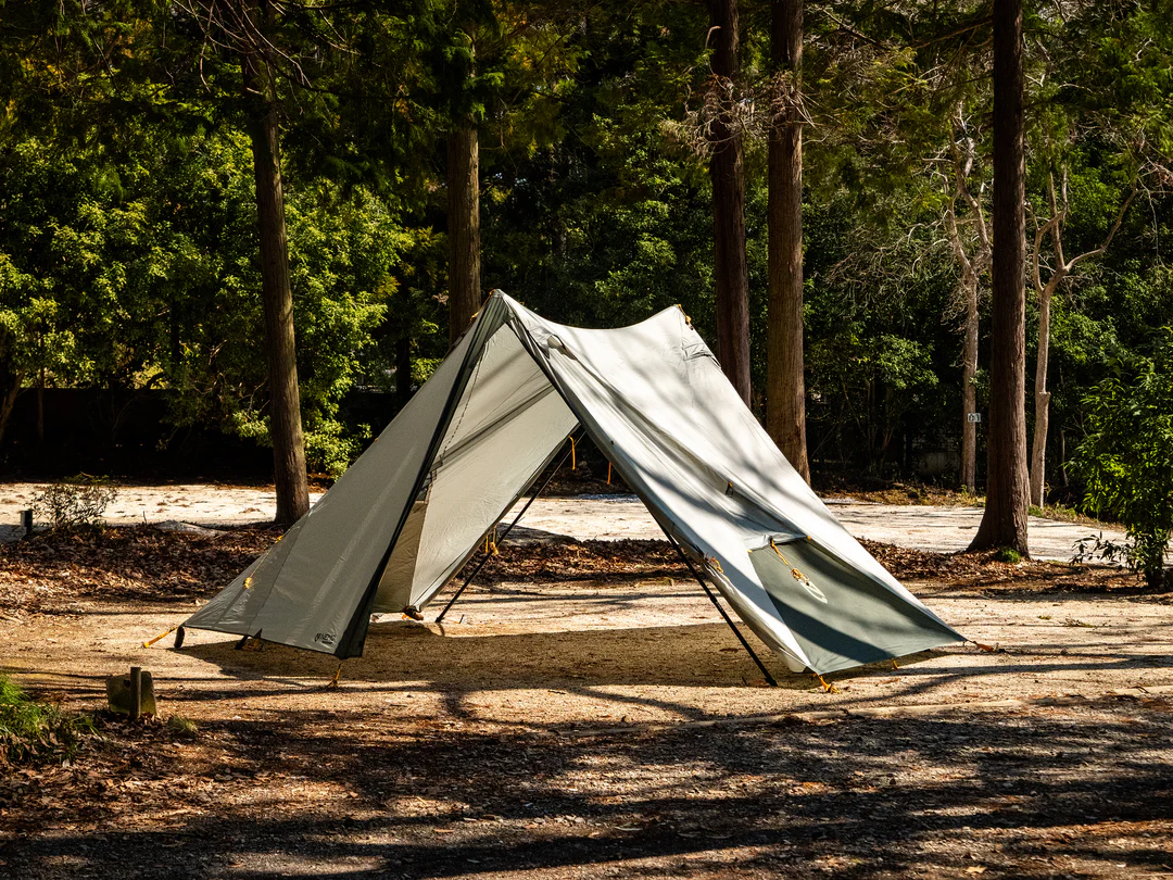 只需將主體展開、用六個地釘固定,再安裝兩根L型可調天幕桿,單人約五分鐘即可完成搭建。內建拉繩清晰標示地釘位置,省去搭建迷惘。