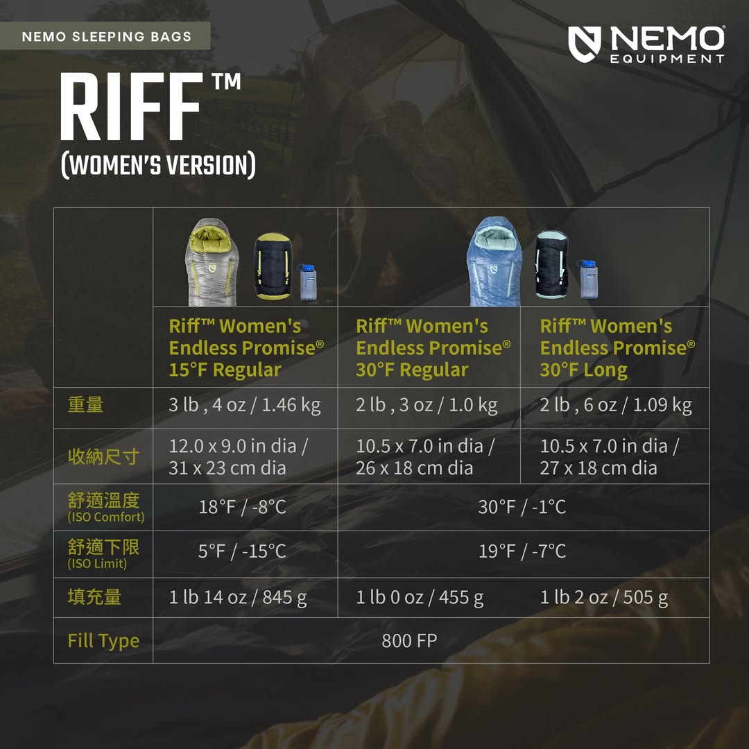 Riff™ 是 NEMO 野外導向的頂級睡袋,也是我們 Endless Promise® 產品套件的最新成員。這款睡袋由單一材料製成,在使用壽命結束時 100% 可回收 - 只需將其送回 NEMO,剩下的事情由它們處理。