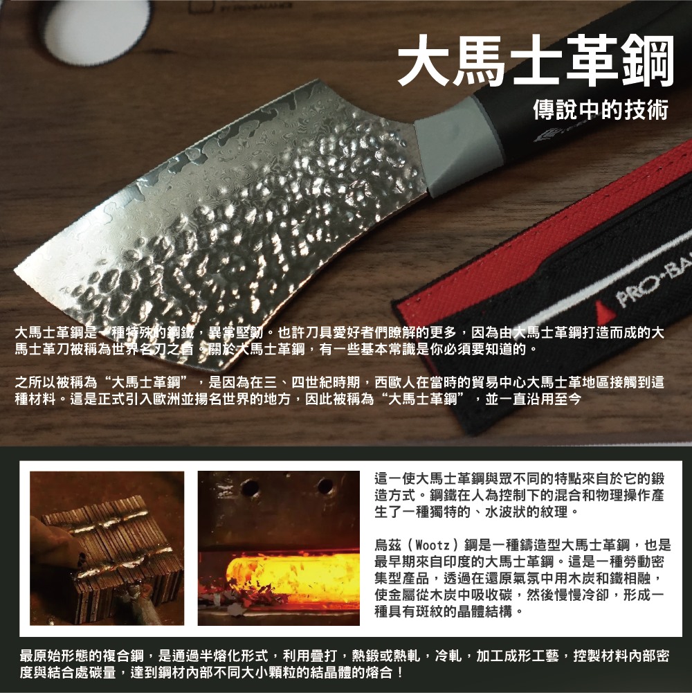 - 大馬士革鋼名稱源自三、四世紀西歐商人於貿易中心「大馬士革」接觸此種鋼材,並從此揚名歐洲及世界,被沿用至今成為高級刀具代名詞。