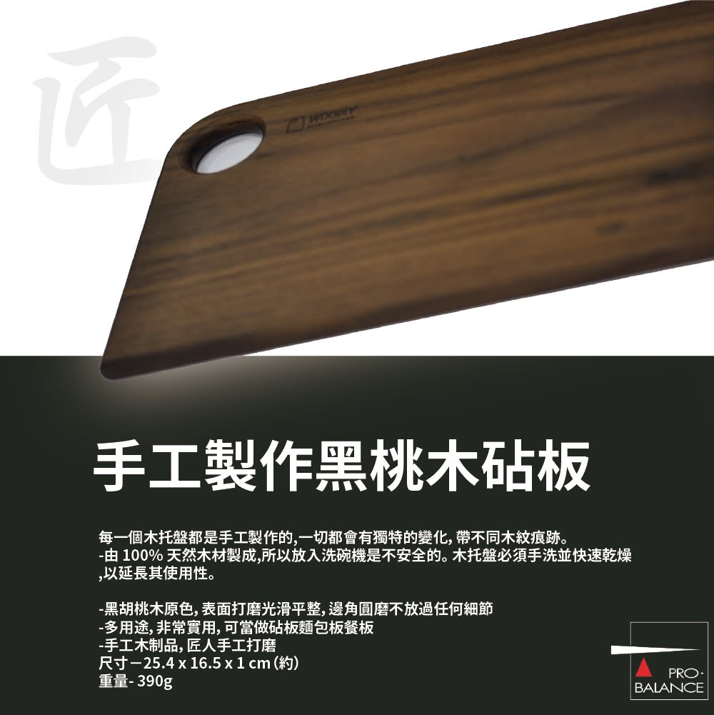 - 砧板以 100% 天然黑桃木製造,由匠人逐件手工打磨,每一塊木紋、色澤都獨一無二,表面光滑平整、邊角圓潤,兼顧外觀與使用手感。