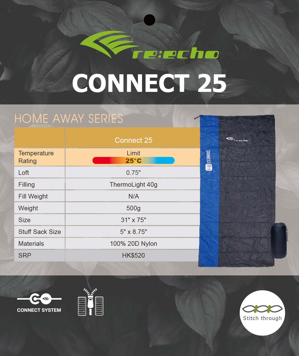 Re:echo Connect 25C 萬用棉睡袋 Re:echo睡袋系列超過一半都可以合併使用,今次都唔例外,專為家庭用家度身訂造嘅親子睡袋 — “Dream Connect”可以同羽絨睡袋合併綿睡袋使用,羽絨一旦濕水就會失去保暖功效,所以以棉睡袋做底層,就算小朋友整污糟都可以將底層嘅棉睡袋直接放入洗衣機,而且兩件睡袋加埋都只係重1200g。 - 信封式剪裁設計增加睡袋舒適程度 - 側拉鍊以及腳拉鍊可以打開後作棉被、披肩或地墊 - 拉鍊方式可以連結成雙人睡袋、能夠與Dreammaker系列合併 - 設有Toggles 系統可與 Reecho的方型睡袋或被子連接,以獲額外的保暖層