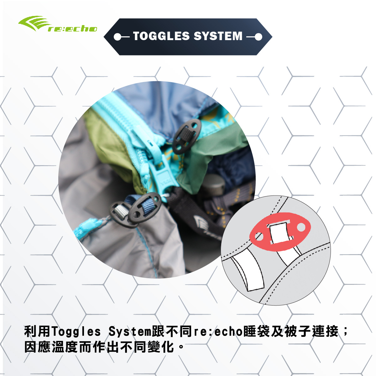 - 設有Toggles 系統可與 Reecho的方型睡袋或被子連接,以獲額外的保暖層