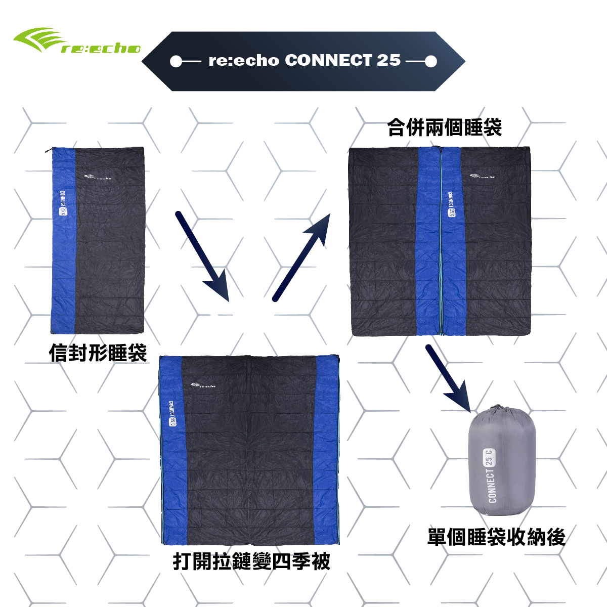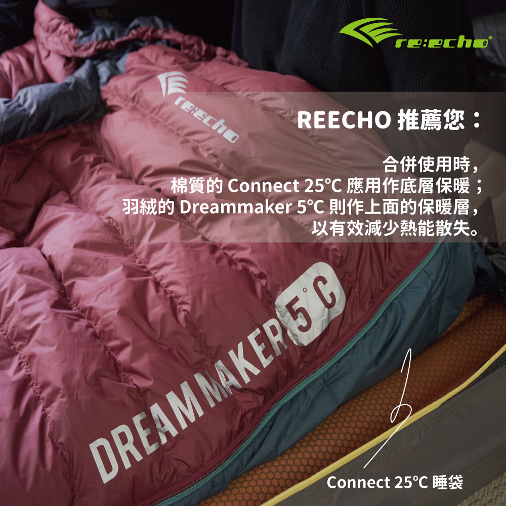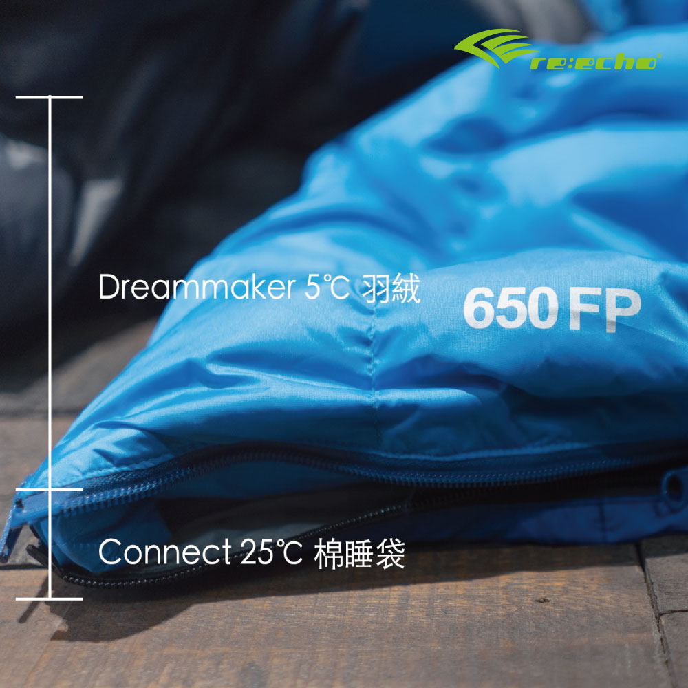 Re:echo睡袋系列超過一半都可以合併使用,今次都唔例外,專為家庭用家度身訂造嘅親子睡袋 — “Dream Connect”可以同羽絨睡袋合併綿睡袋使用,羽絨一旦濕水就會失去保暖功效,所以以棉睡袋做底層,就算小朋友整污糟都可以將底層嘅棉睡袋直接放入洗衣機,而且兩件睡袋加埋都只係重1200g。