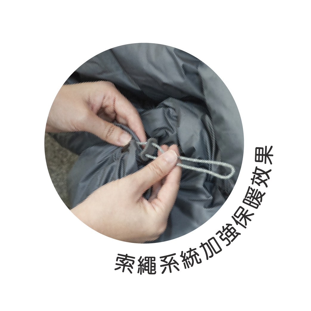 - 運用兩邊喼鈕連接系統對摺,再扣上腳底喼鈕和索繩收緊腳部可變為睡袋模式使用,加強保暖效果