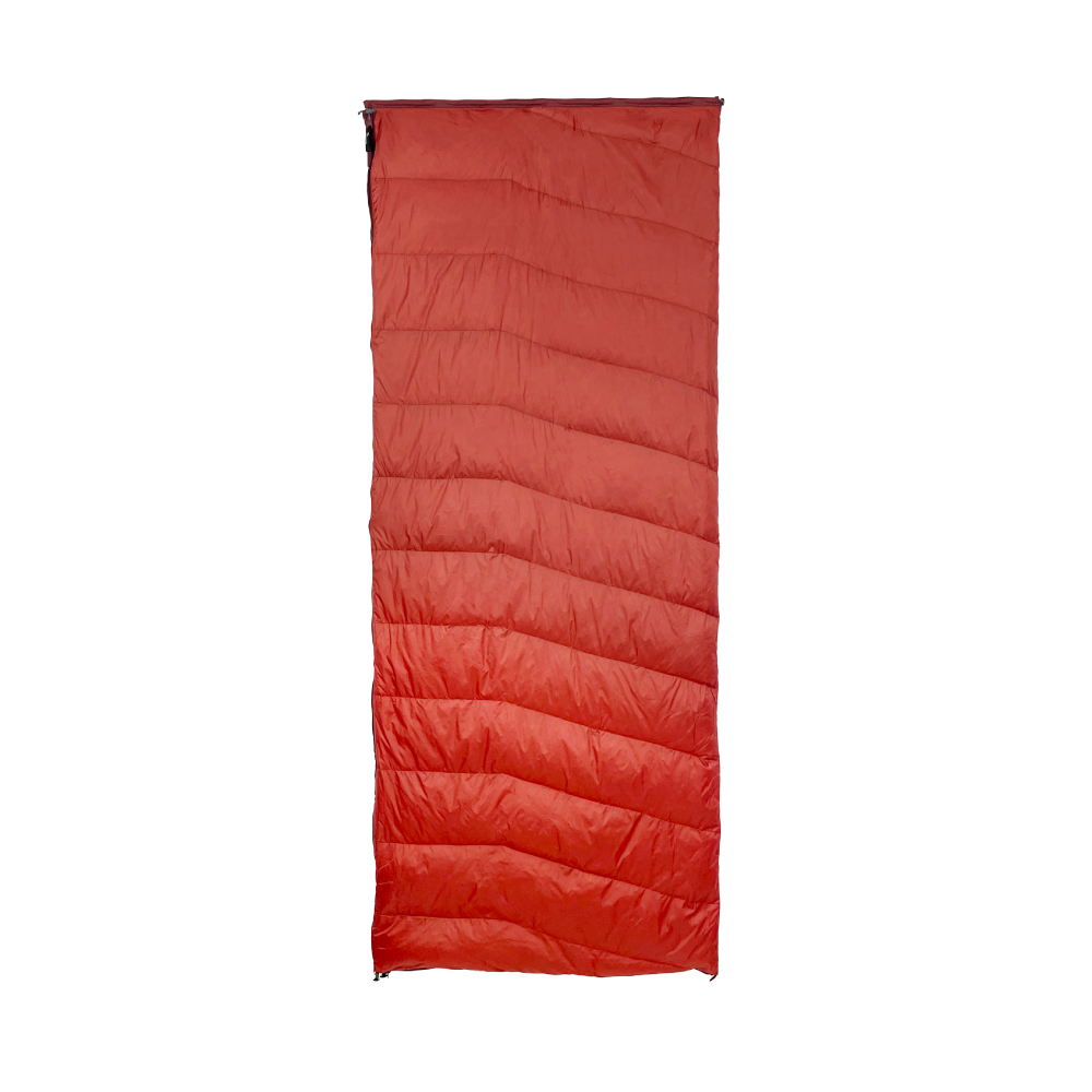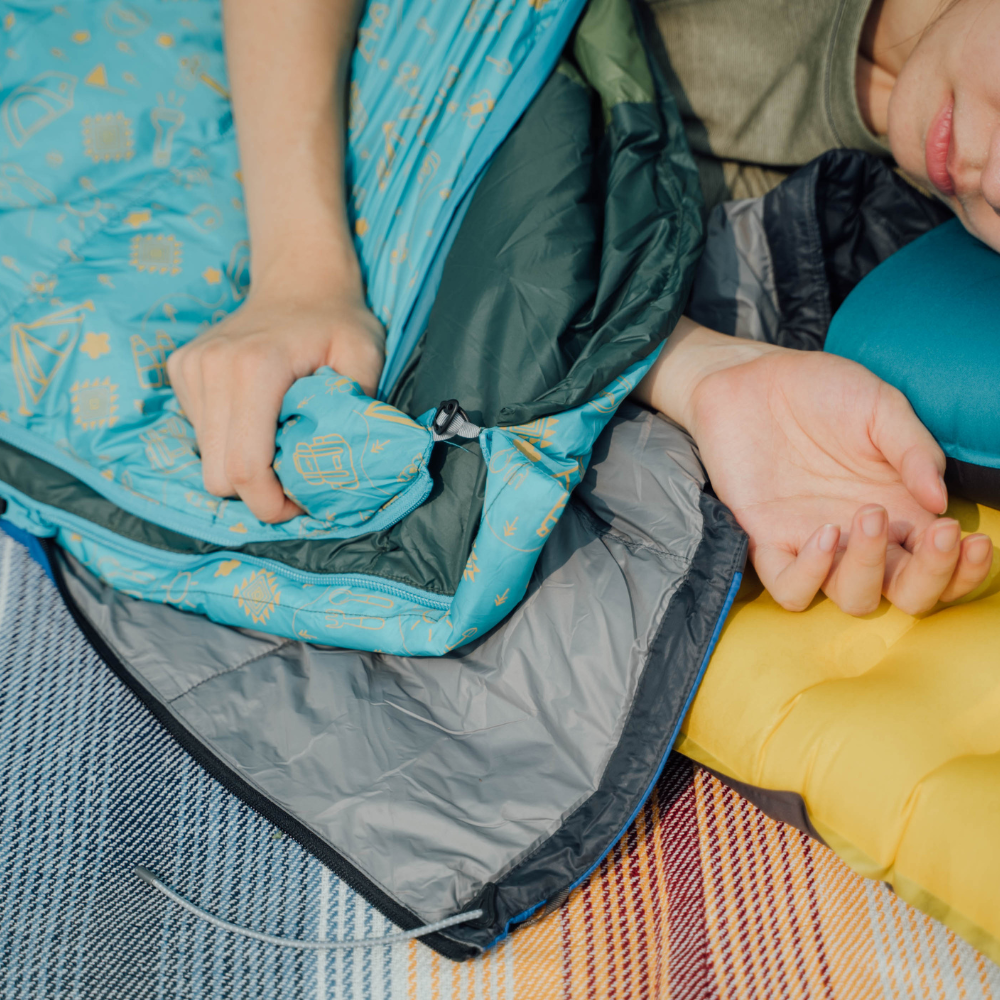 而信封式剪裁設計增加睡袋舒適程度,於坐圍以下有更寬敞空間活動,並可當作室內被或摺成單人睡袋使用。
