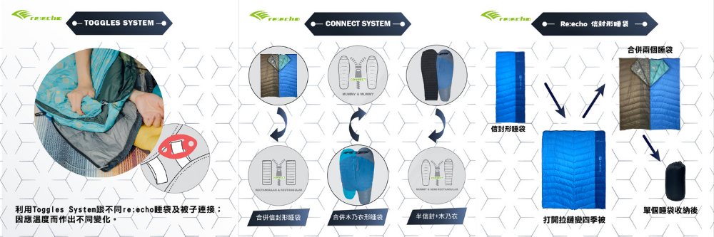 re:echo是一個誕生於香港、由地道團隊主理的專業戶外品牌,自2007年創立以來,一直以「為香港人設計」為核心宗旨,專注研發適合本地及亞洲人體型、天氣和生活節奏的戶外裝備。品牌致力將國際技術與本地創意結合,由開發、設計、生產至零售一條龍自家經營,為港人及亞洲戶外愛好者帶來最貼心、最高質的羽絨睡袋及戶外配件。每一款產品都細心考慮香港濕熱、潮濕、溫差大的氣候環境,力求功能、舒適度、易用性兼備,讓你無論露營、行山還是家居都能獲得最佳體驗,活出屬於香港戶外人的生活態度。
